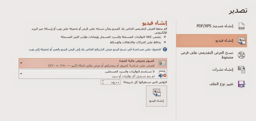 اقدم لكم اليوم طريقة لحفظ ملفات العروض التقديمية الى فيديو عالي الجودة ، في وقت سابق كنا نستخدم برامج لتحويل العروض الى ملفات فيديو باستخدام برامج كثيرة ومشهورة ومتنوعة واليوم اقدم لكم طريقة سهلة باستخدام برنامج بور بوينت 2013 بلس بسهولة ويسر حيث قامت مايكروسوفت باضافة عدة ميزات الى البرنامج ومنها تحويل العروض الى ملفات فيديو بسهولة وسرعة ونقاء عالي ويعتمد حجم الملف الناتج على الحركات المستخدمة والصور وملفات الصوت حيث تكون بعض التأثيرات بعد تحويلها الى ملفات كبيرة الحجم تتعدى ال 1 جيجا بايت ( ملف عالي الجودة ) حيث بامكانك اختيار الجودة التي تناسبك من الخيارات ..