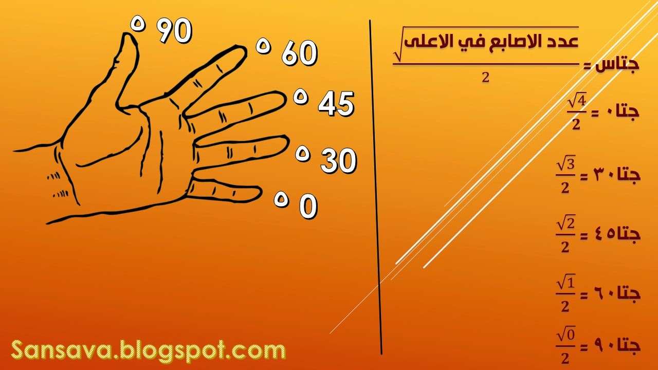 السلام عليكم احبابي في الله اليوم سنقدم لكم طريقة سهلة لحساب الدوال المثلثية (جاس-sinx) ( جتاس -cosx) للزوايا الخاصة وهي ( 0، 30 ،45، 60 ، 90 ) بطريقة سهلة ومبسطة جداً . تمعن عزيزي في الصورة التالية جيداً ولاحظ ان كل اصبح من الاصابع مكتوب بجانبة زاوية معينة .